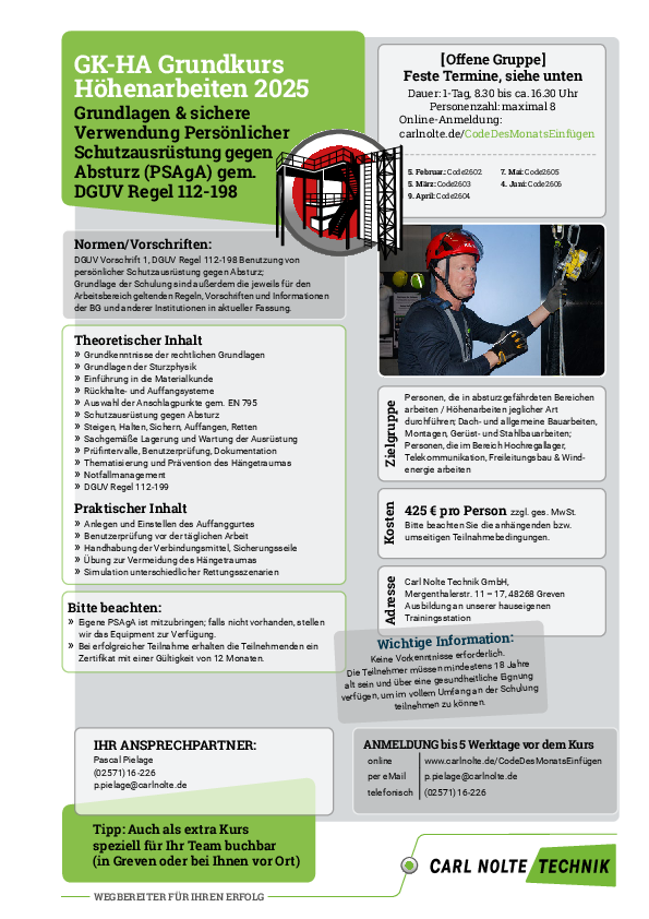 In diesem Kurs erwerben Sie umfassende Kenntnisse zur Verwendung von PSAgA in den verschiedensten Arbeitssituationen. Der Kurs richtet sich u.a. nach den Inhalten der DGUV Regel 112-198 sowie DGUV Vorschrift 1.