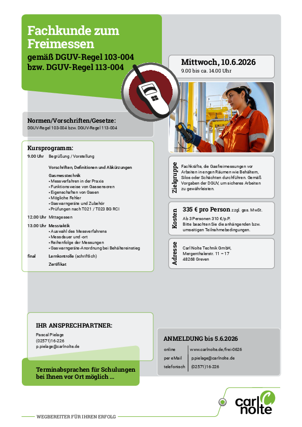 Dieser Kurs richtet sich an Fachkräfte, die Gasfreimessungen vor Arbeiten in engen Räumen durchführuen, um sicheres Arbeiten zu gewährleisten.